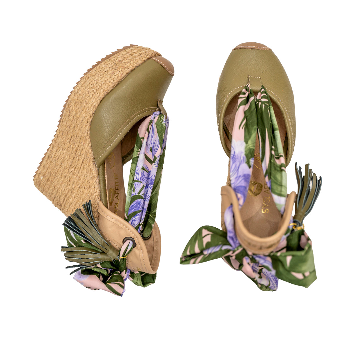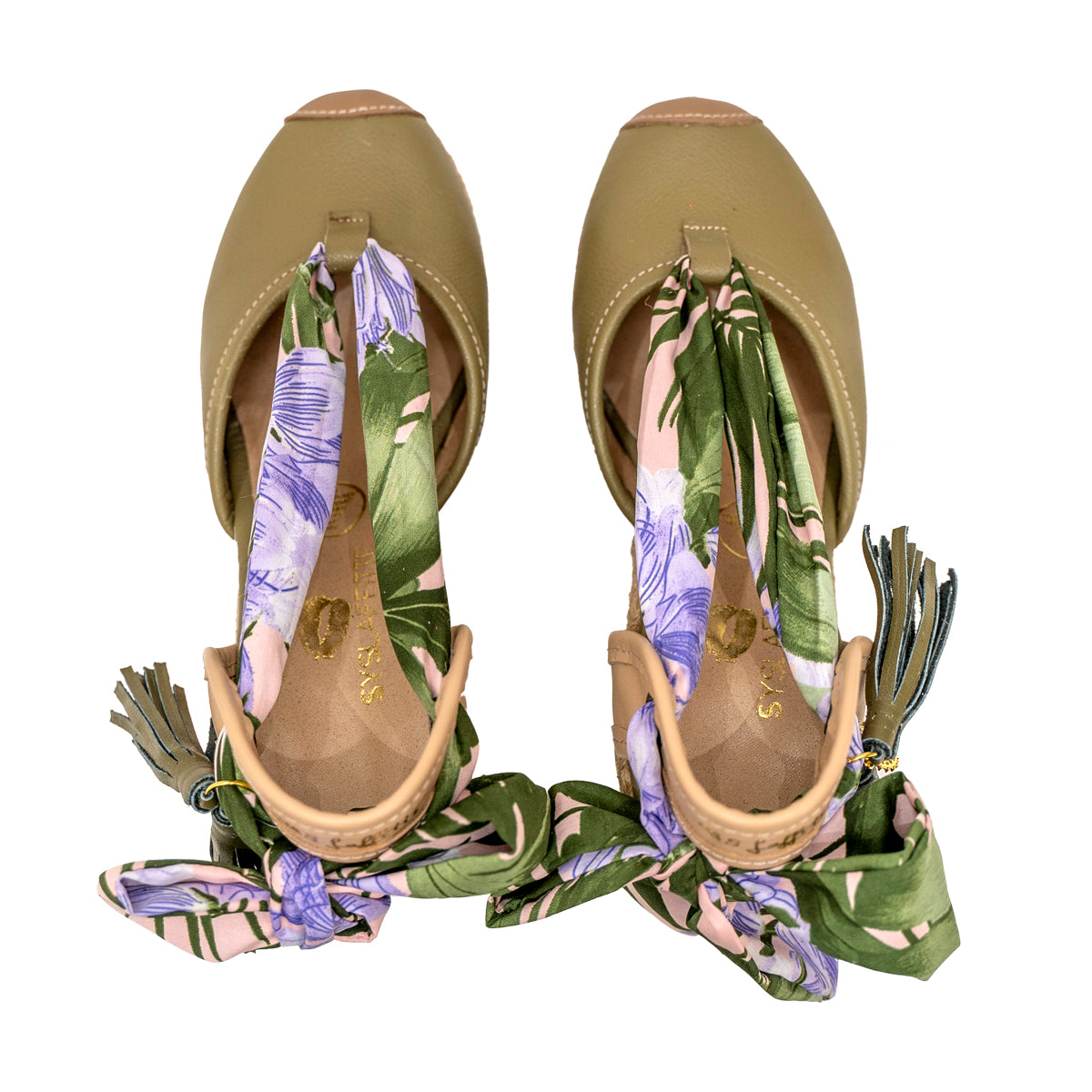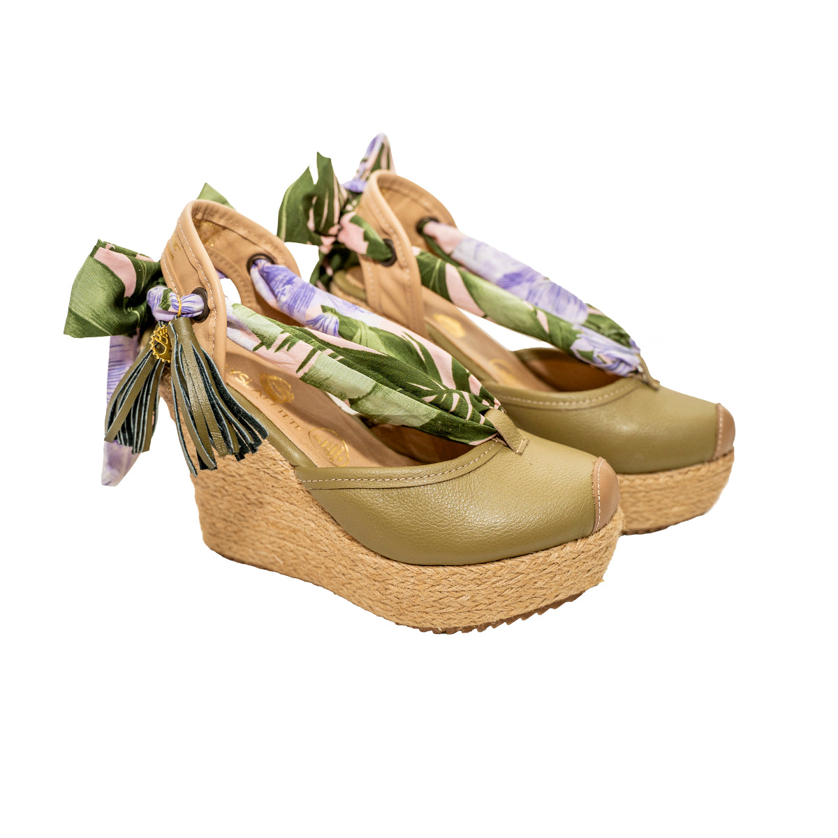 Alpargatas cerradas 100 % piel, cómodas con tacón de 10 cm. Incluyen mascada y pompón a tu elección. Personalizalas aún más con accesorios extras disponibles en la sección Mascadas, Pompones y Pines.