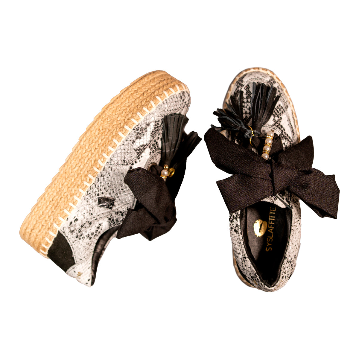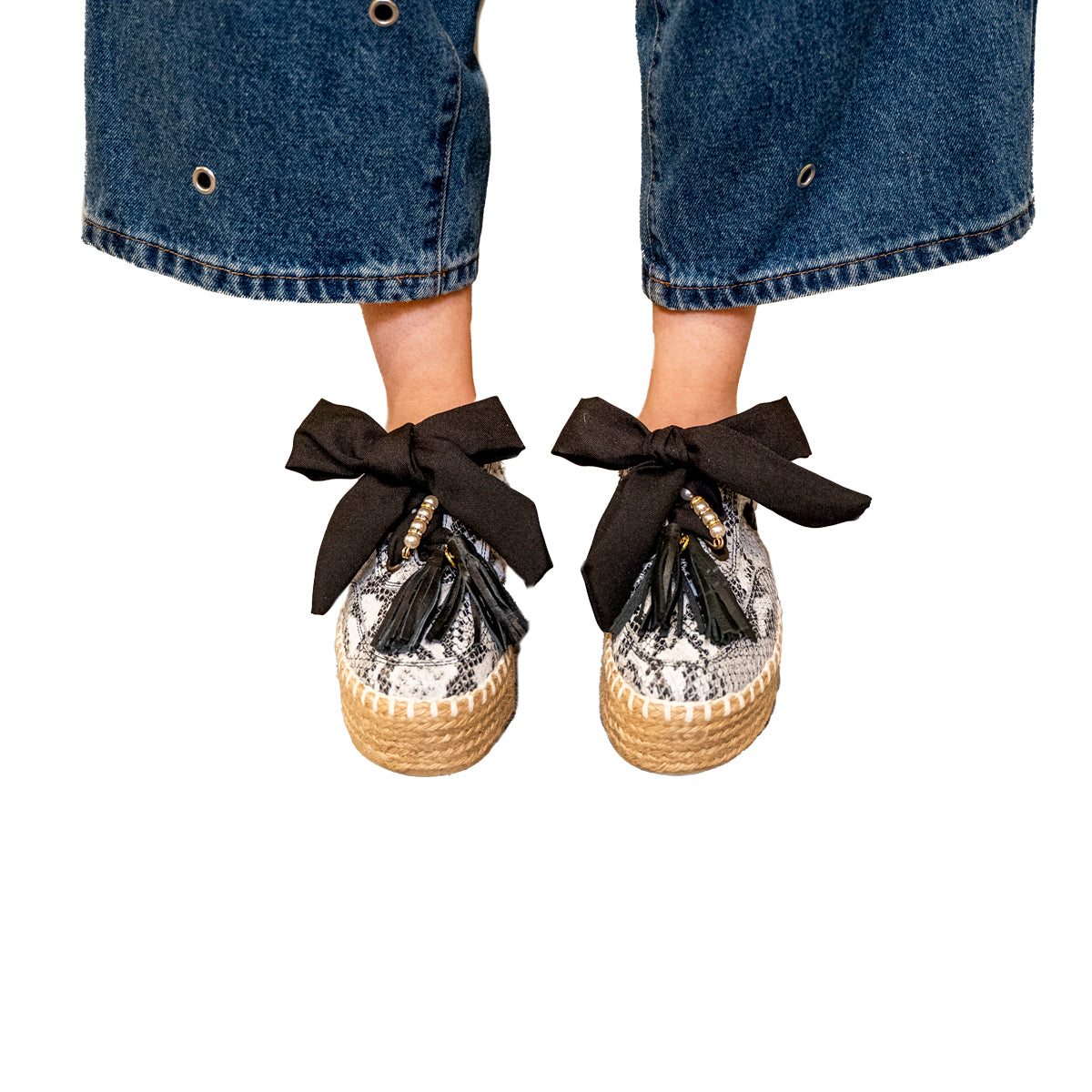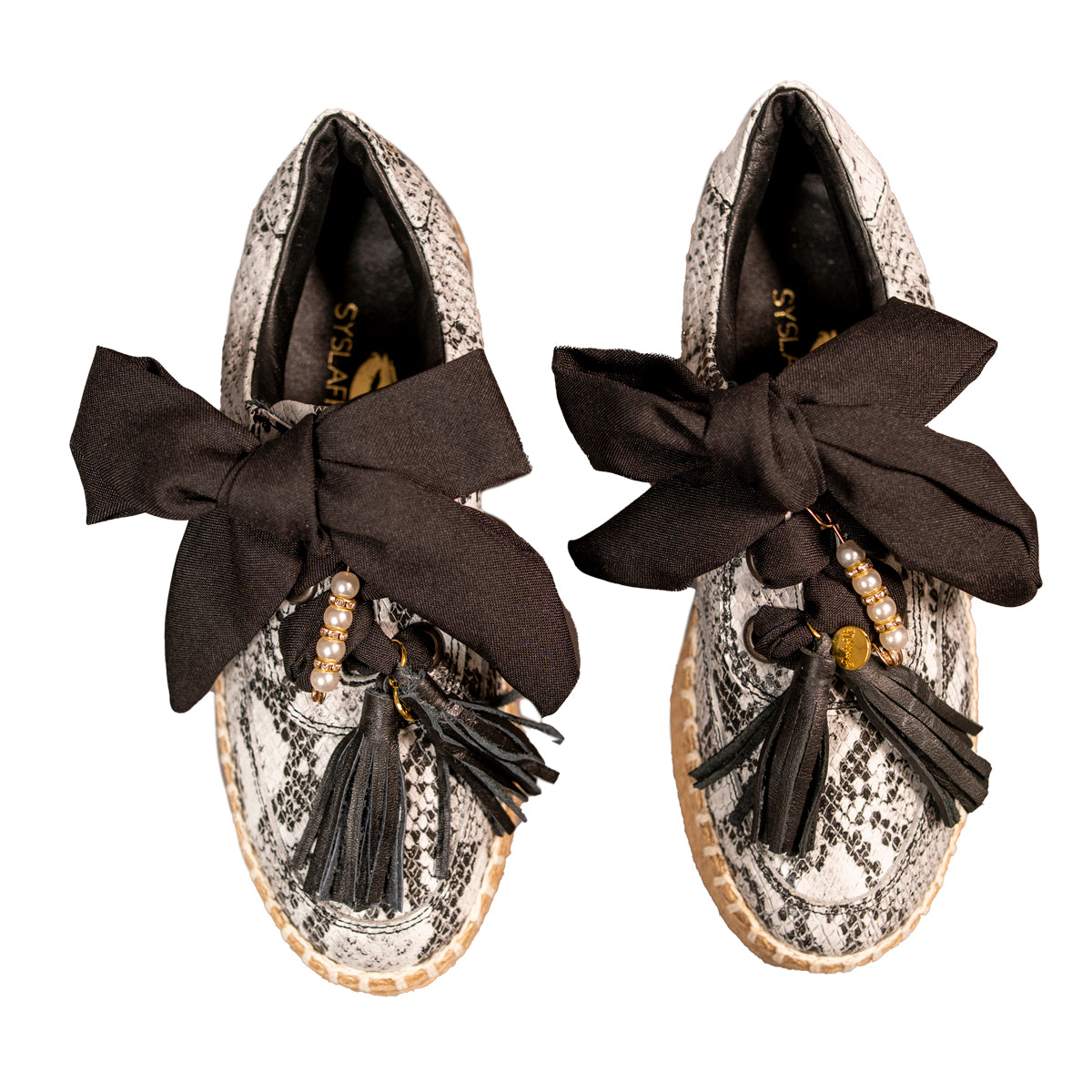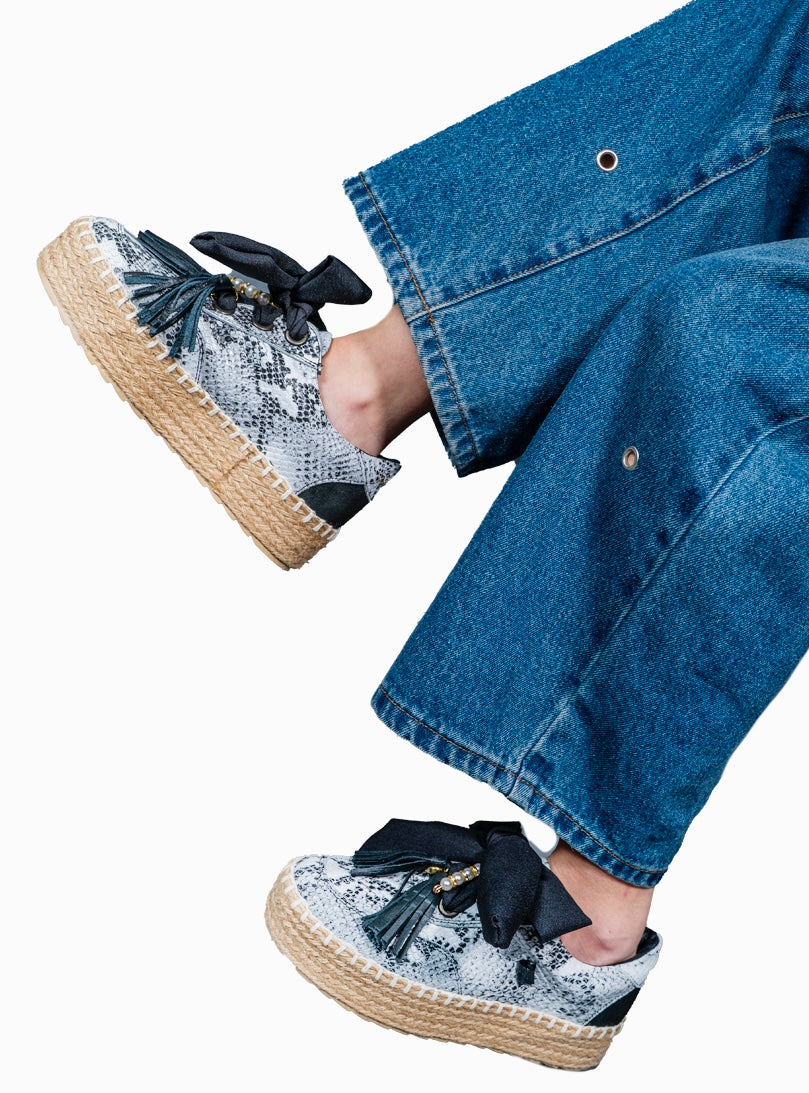 Nuestros zapatos son 100% piel, 5 cm de altura, yute, ultra cómodos y cada par incluye una mascada y un pompón. ¡Personalízalos aún más! También puedes comprar mascadas, pompones y pines por separado. Descubre la colección completa