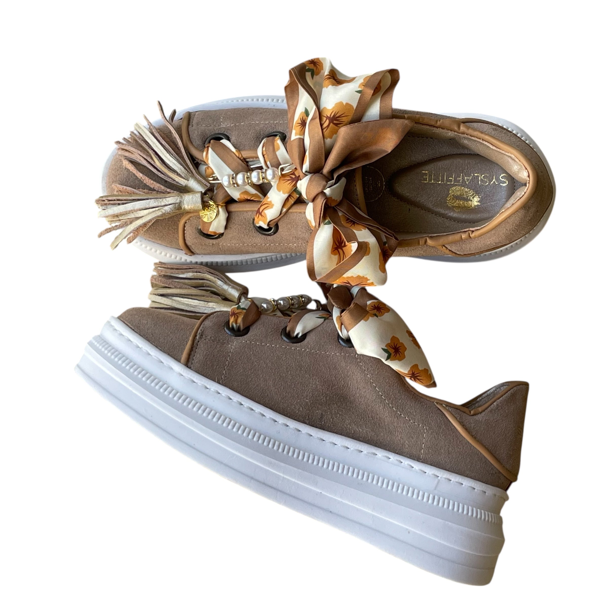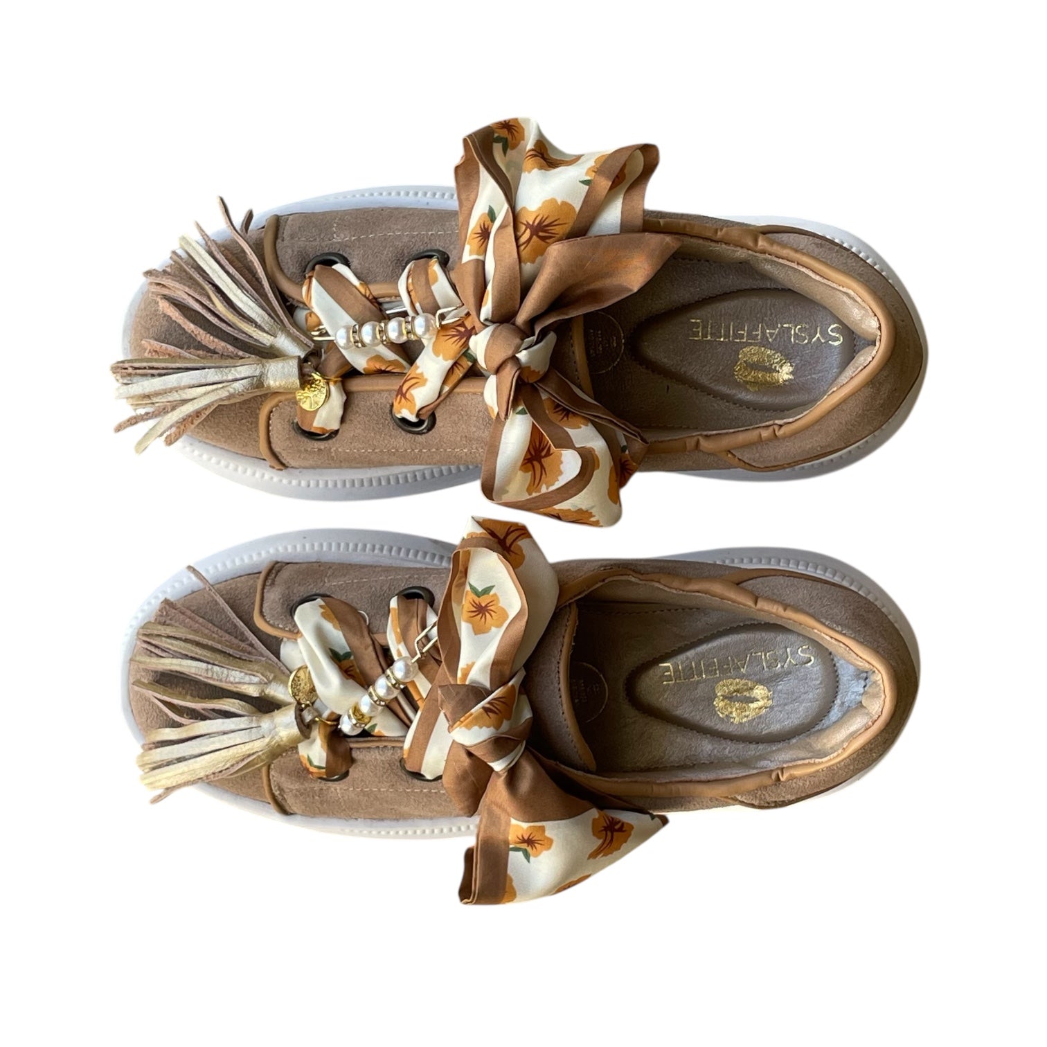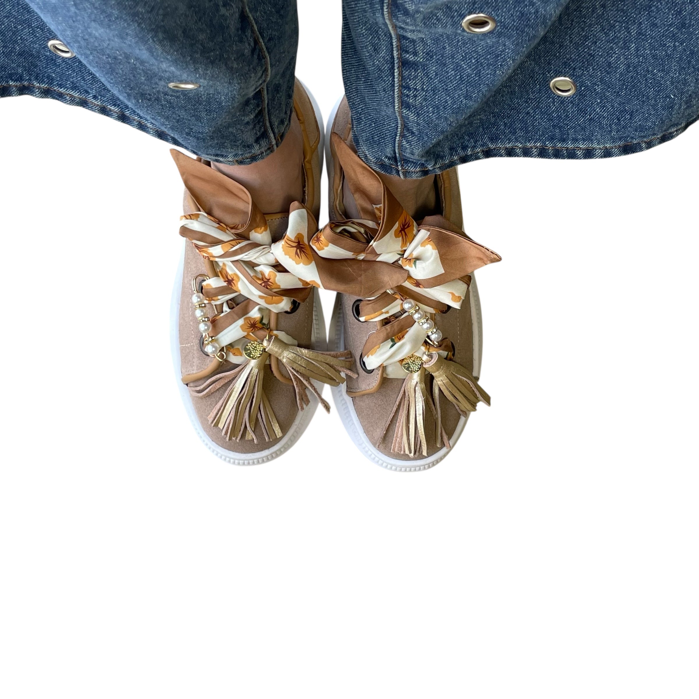 Nuestros zapatos son 100% piel, ultra cómodos y cada par incluye una mascada y un pompón. ¡Personalízalos aún más! También puedes comprar mascadas, pompones y pines por separado. Descubre la colección completa.