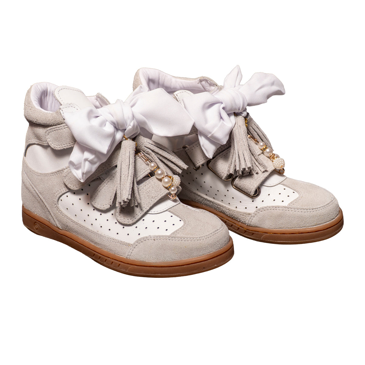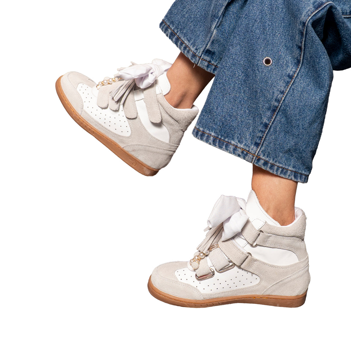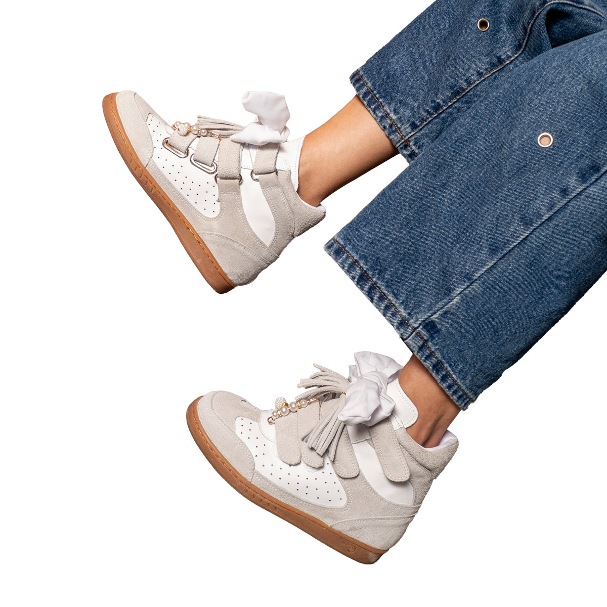 Nuestros tenis botín 100% piel en color blanco ofrecen diseño, comodidad y altura en un solo modelo.