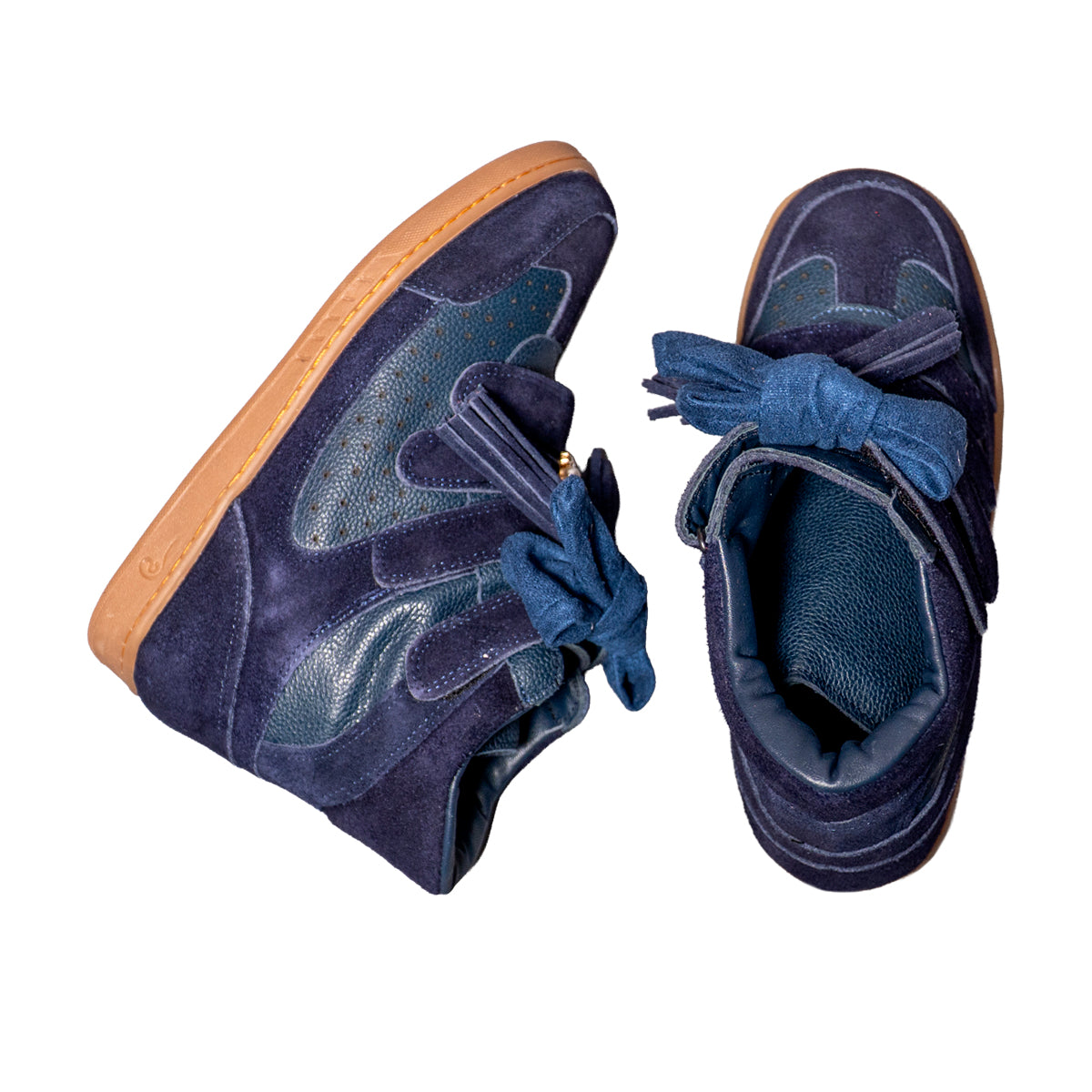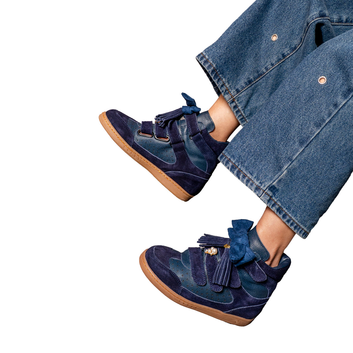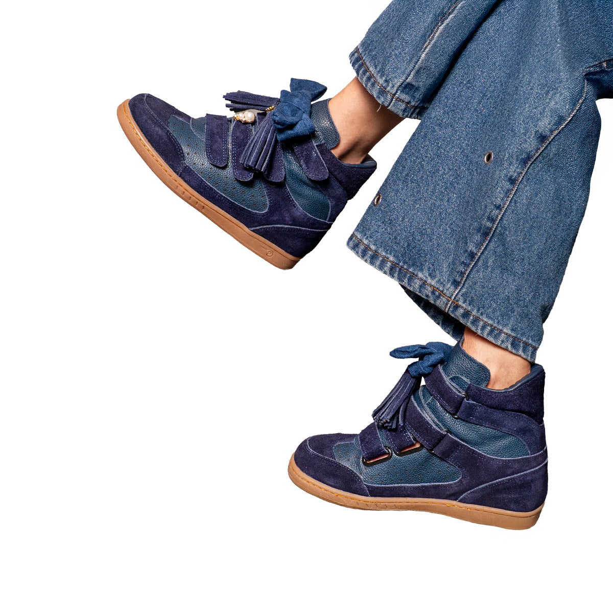 Nuestros tenis botín 100% piel en color marino ofrecen diseño, comodidad y altura en un solo modelo.