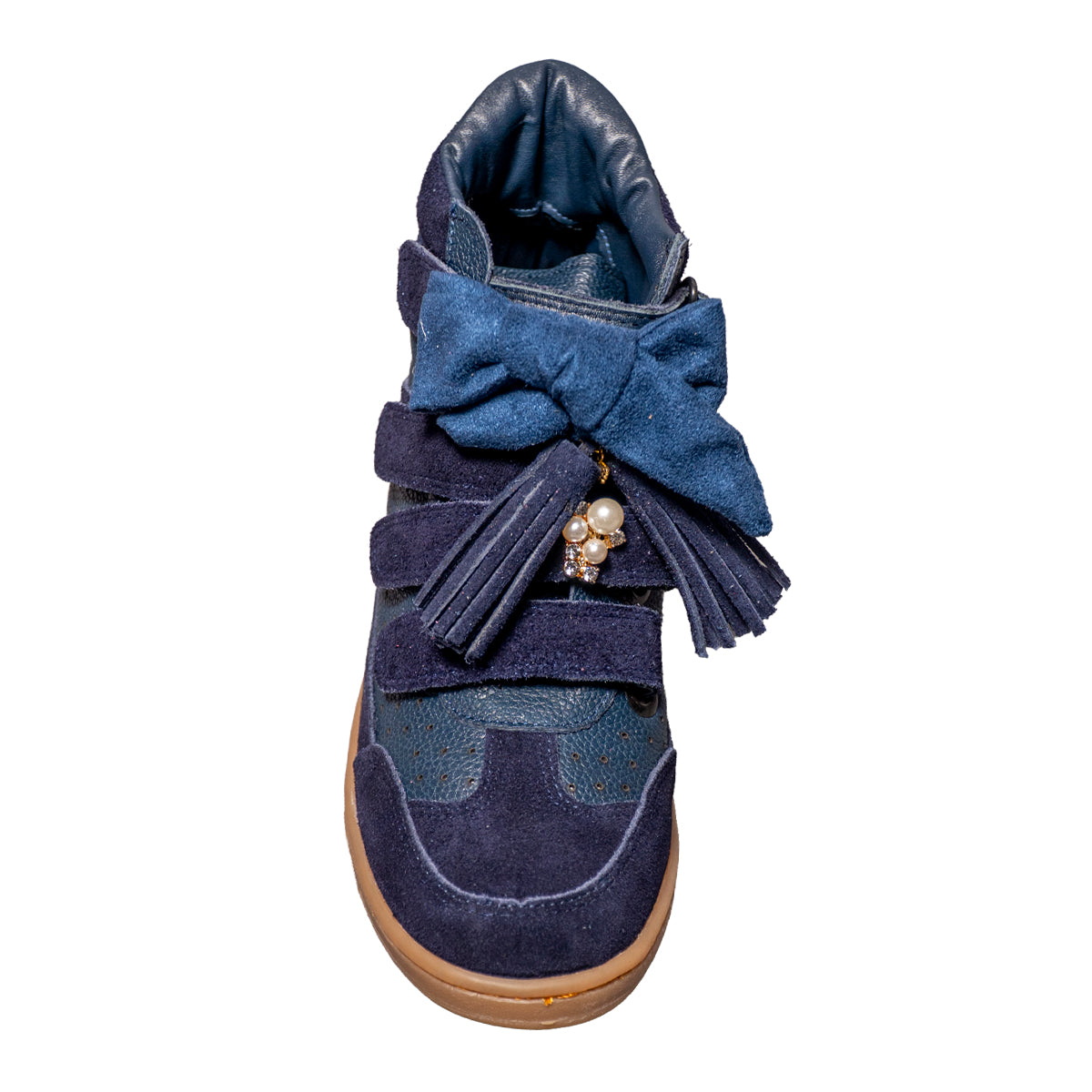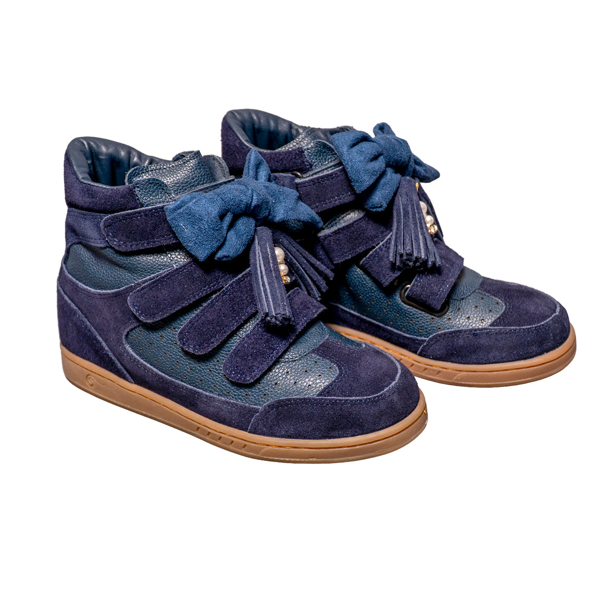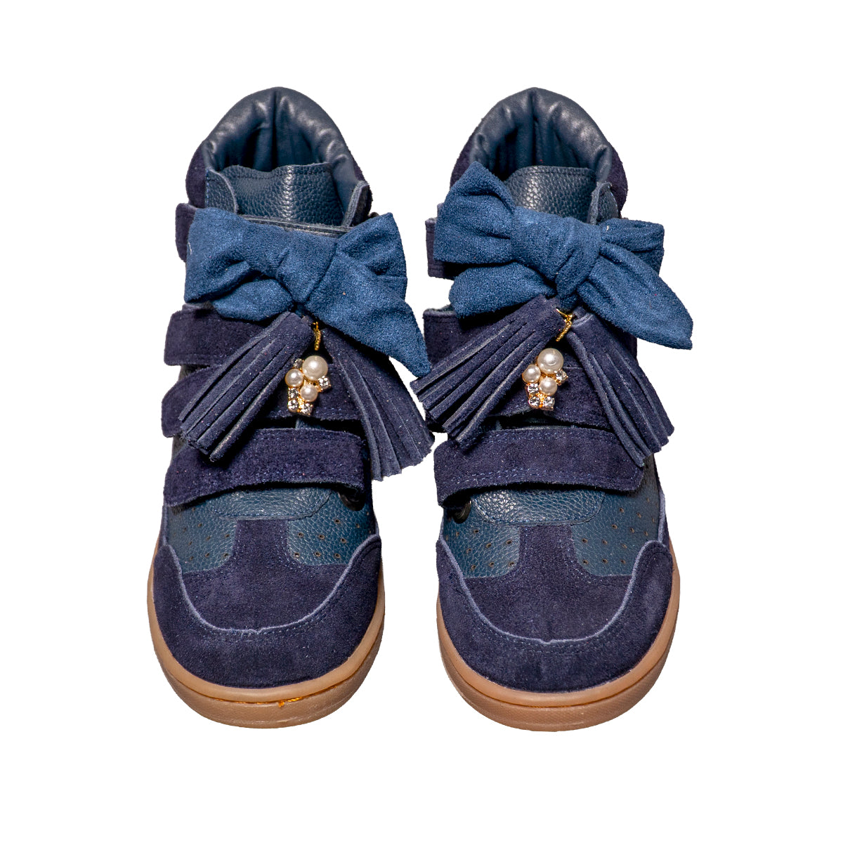 Nuestros tenis botín 100% piel en color marino ofrecen diseño, comodidad y altura en un solo modelo.