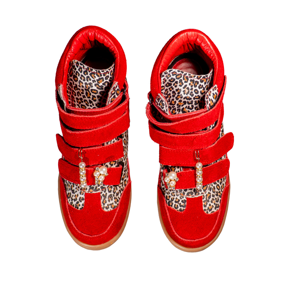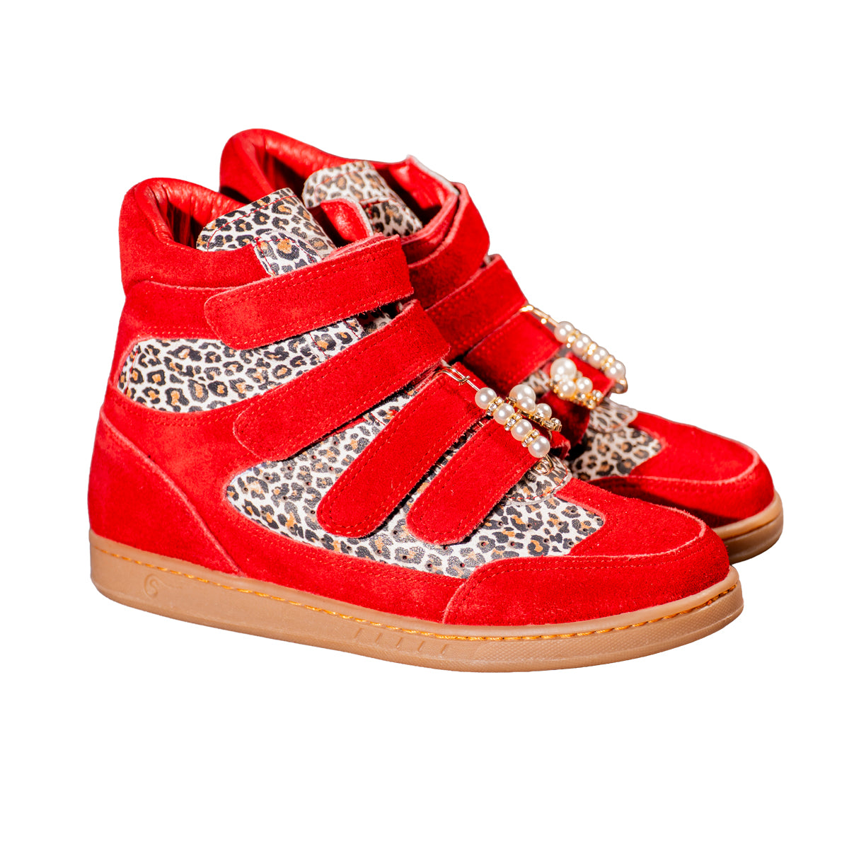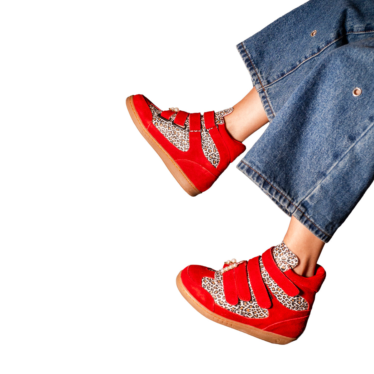Nuestros tenis botín 100% piel en color rojo con animal print ofrecen diseño, comodidad y altura en un solo modelo.