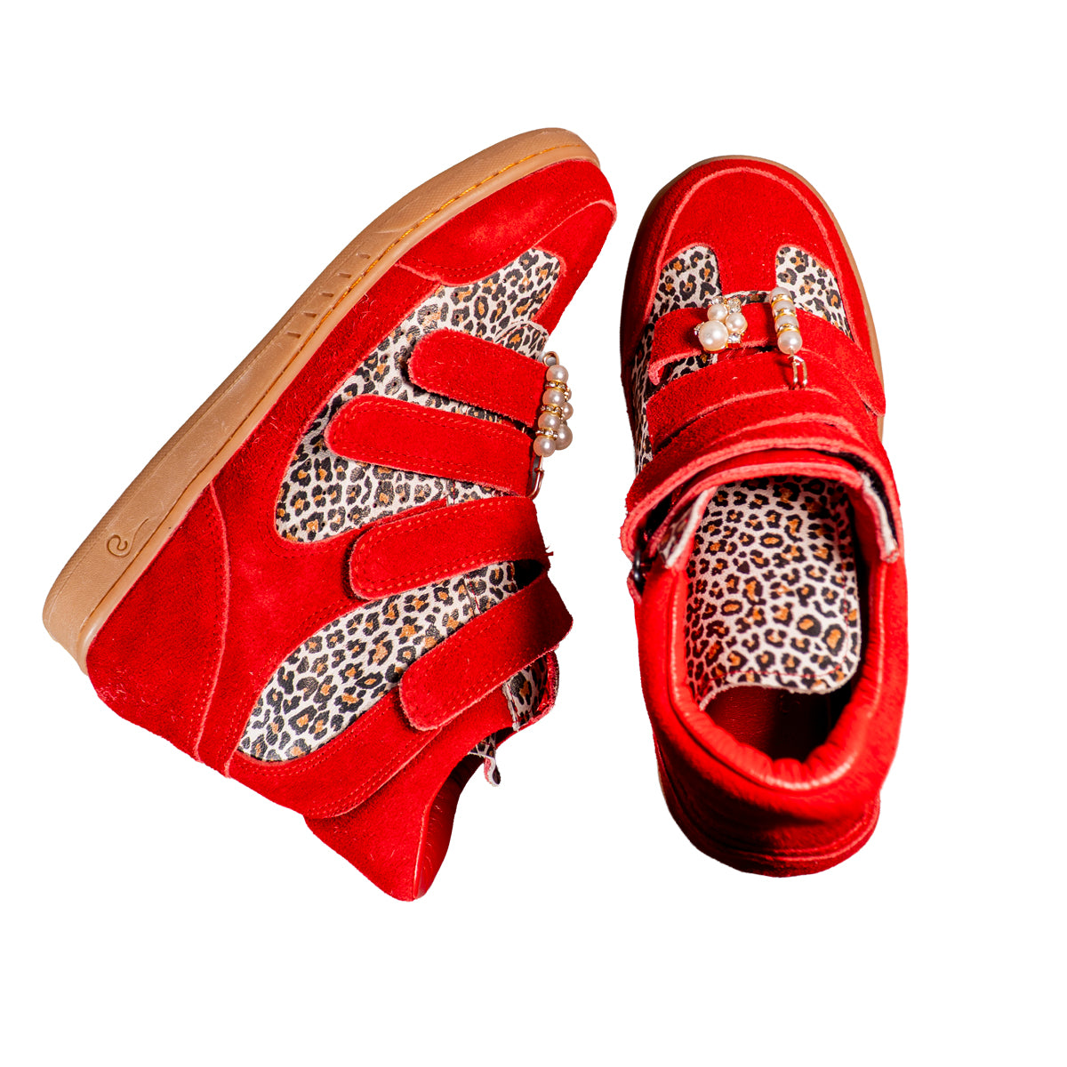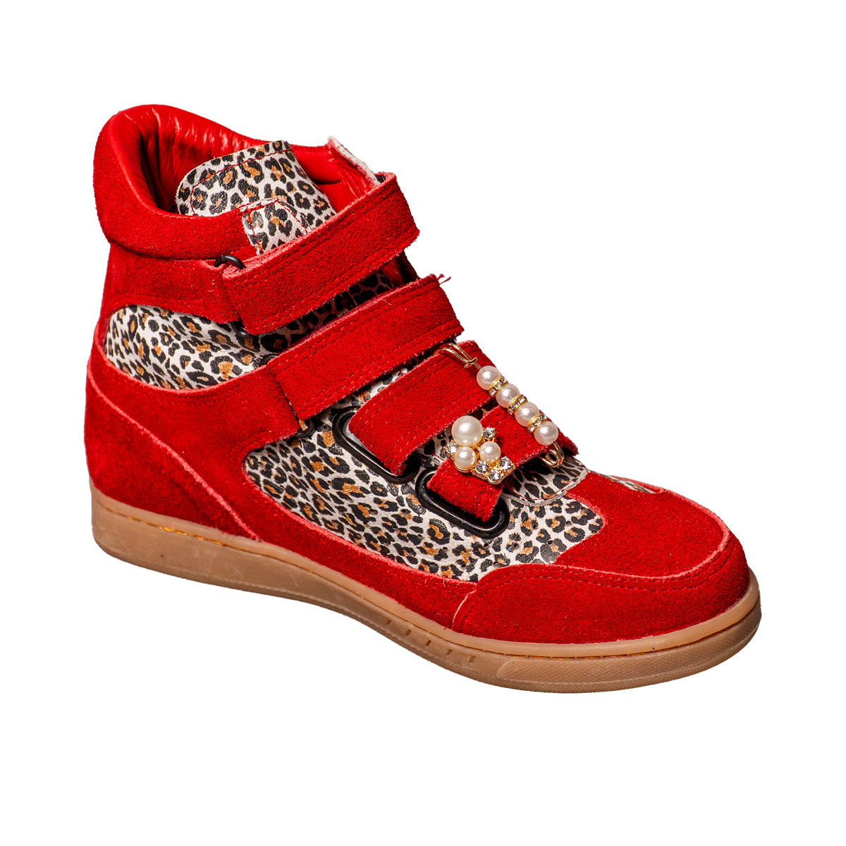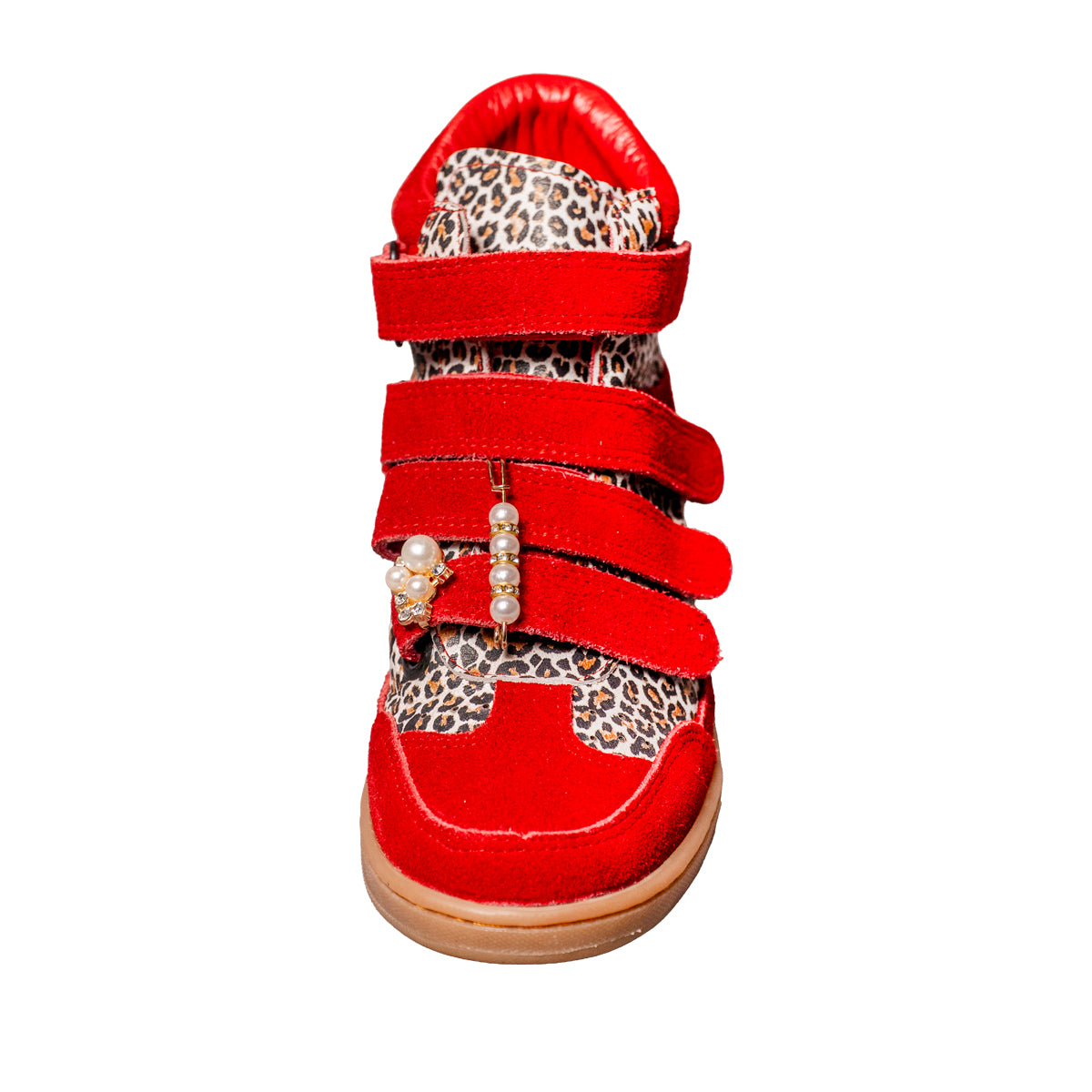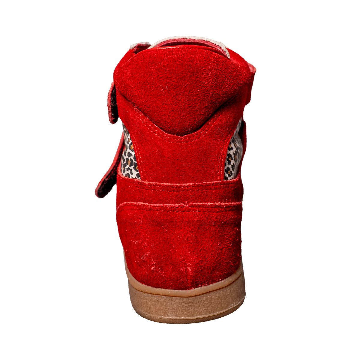 Nuestros tenis botín 100% piel en color rojo con animal print ofrecen diseño, comodidad y altura en un solo modelo.