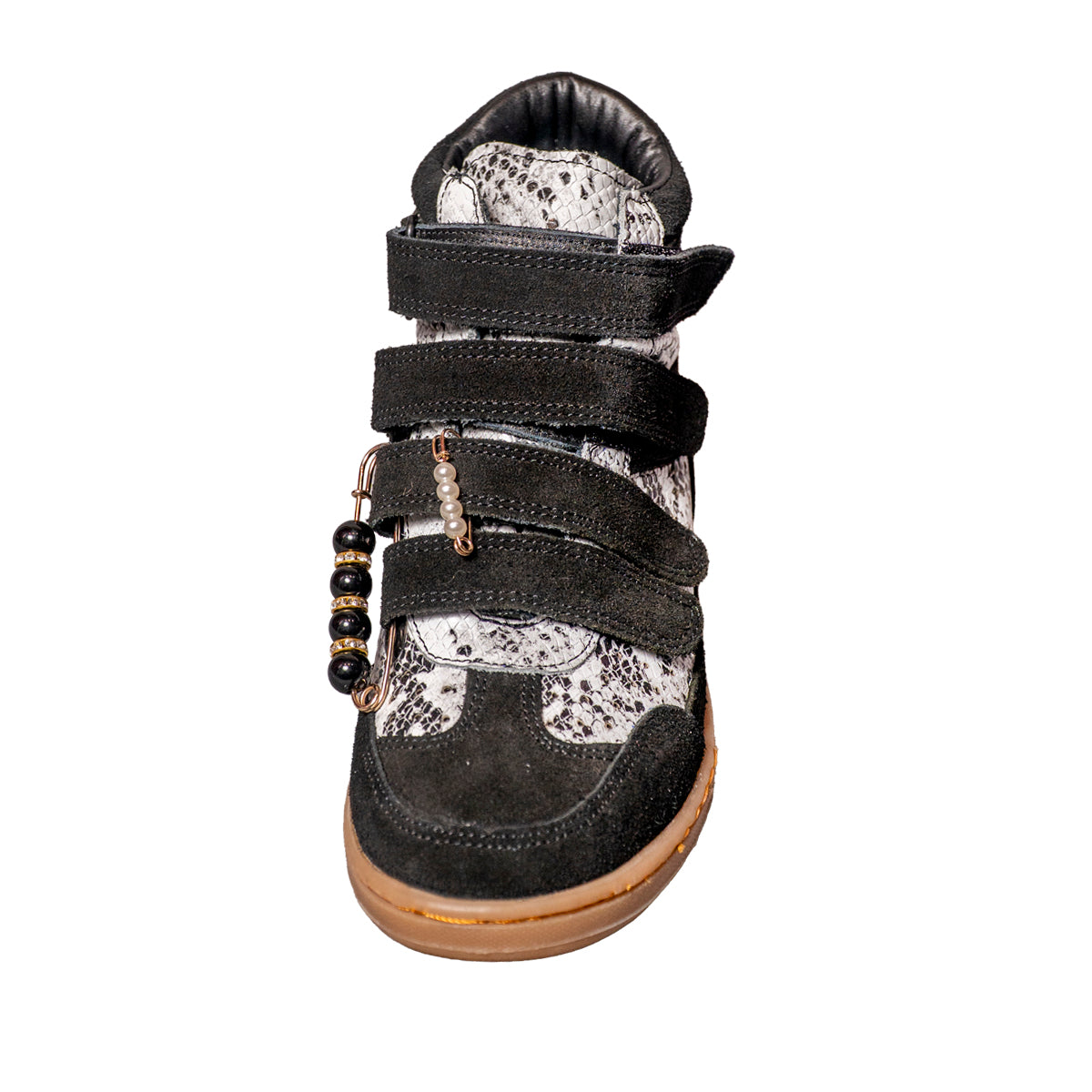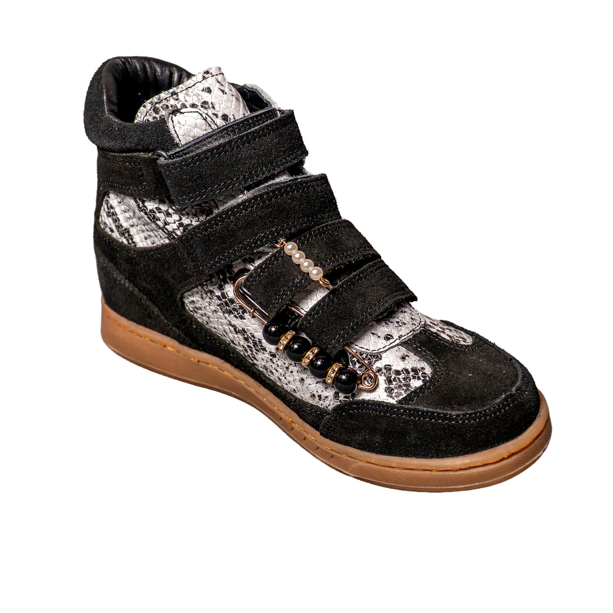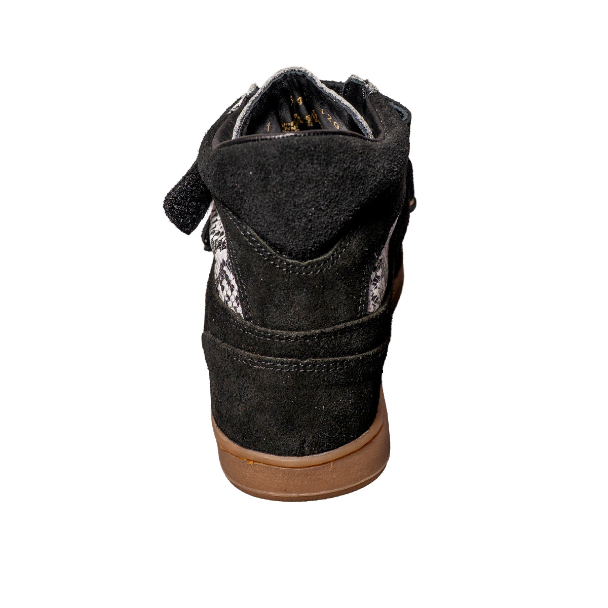Nuestros tenis botín 100% piel en color negro con serpiente ofrecen diseño, comodidad y altura en un solo modelo.