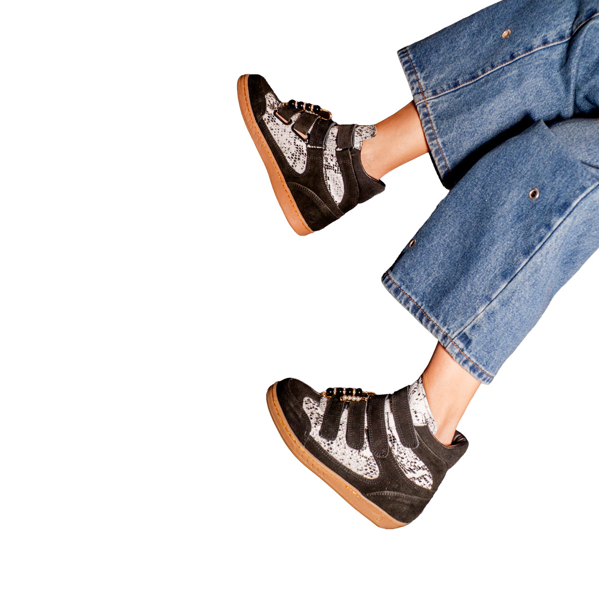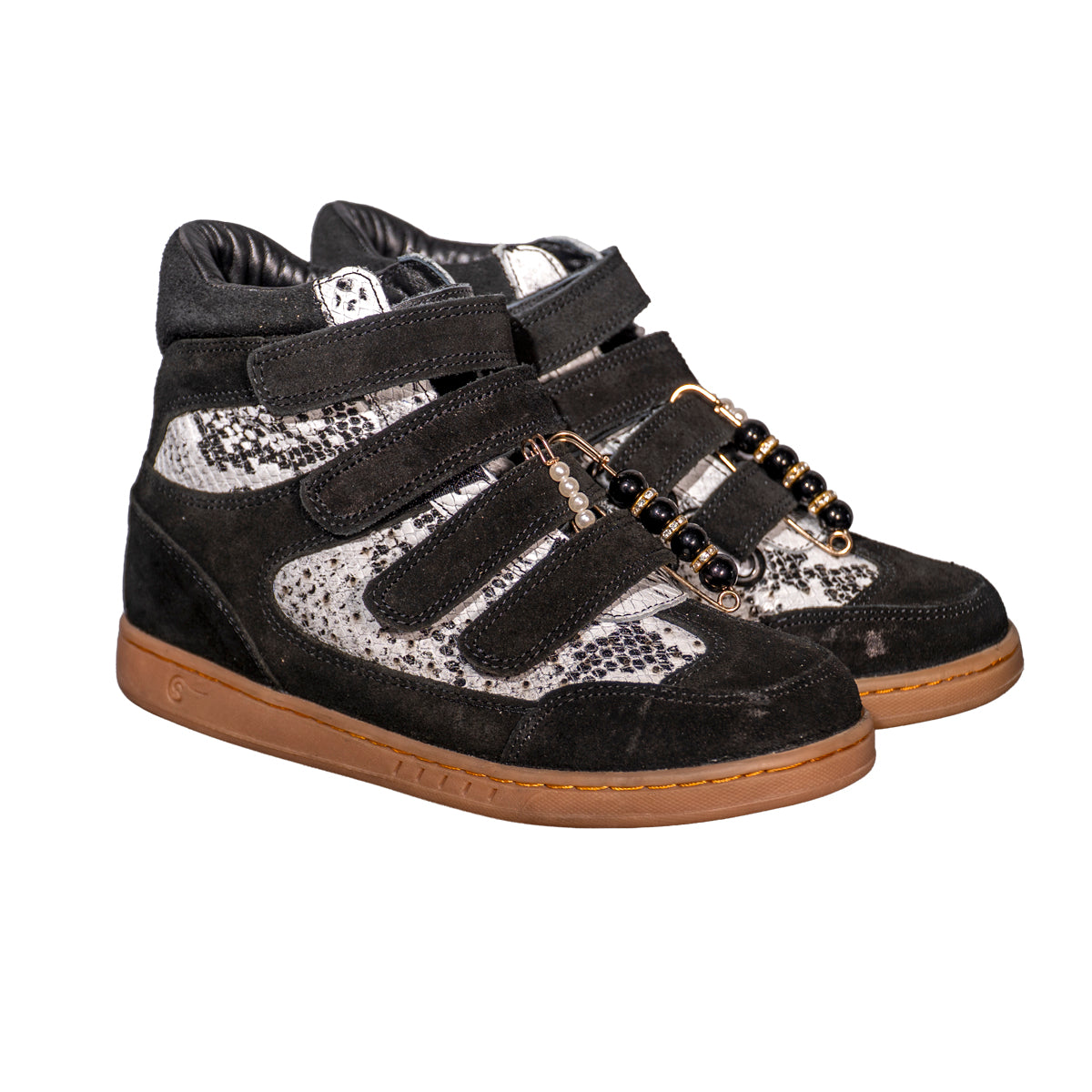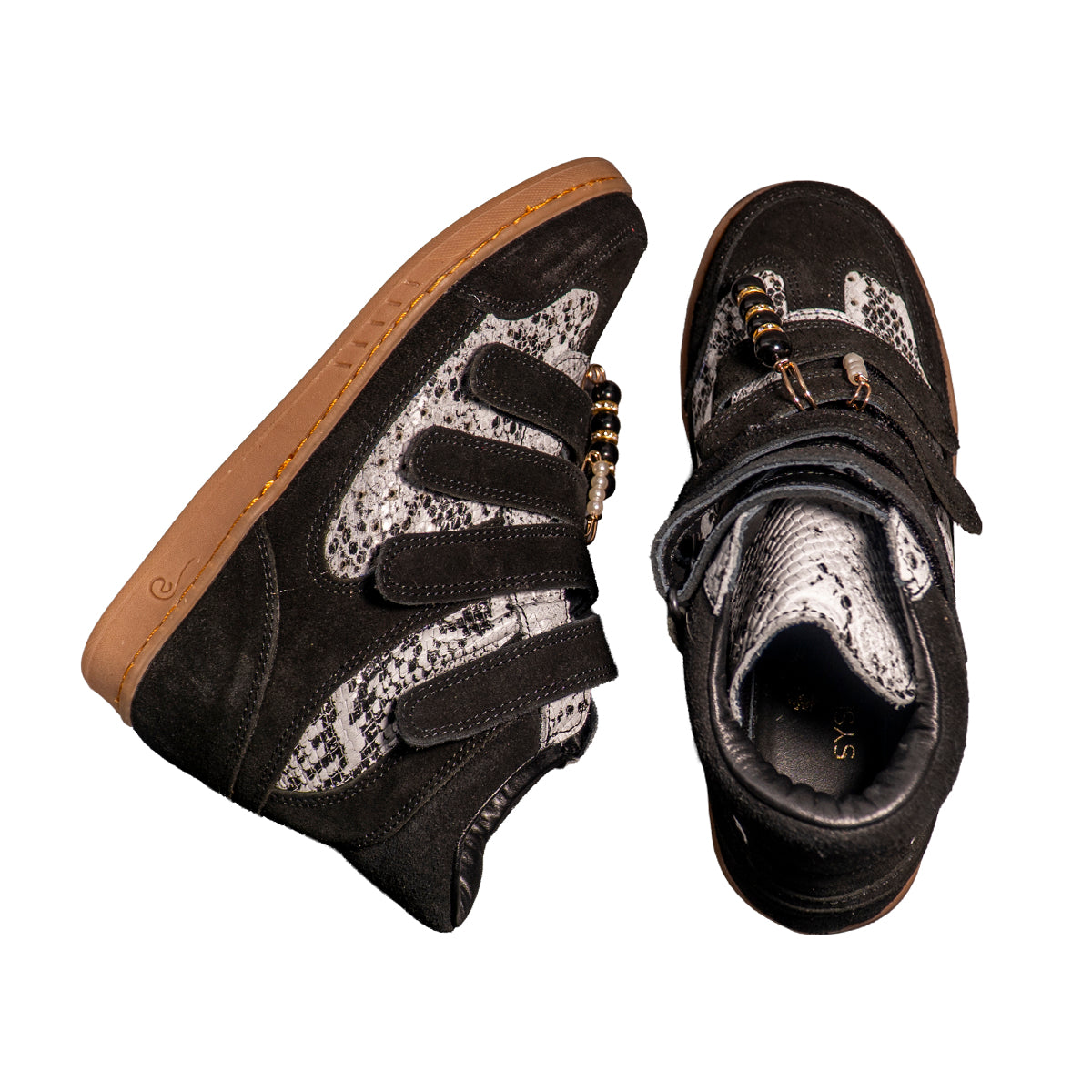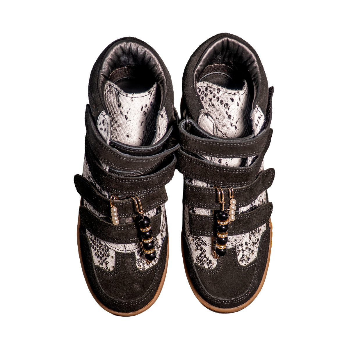 Nuestros tenis botín 100% piel en color negro con serpiente ofrecen diseño, comodidad y altura en un solo modelo.
