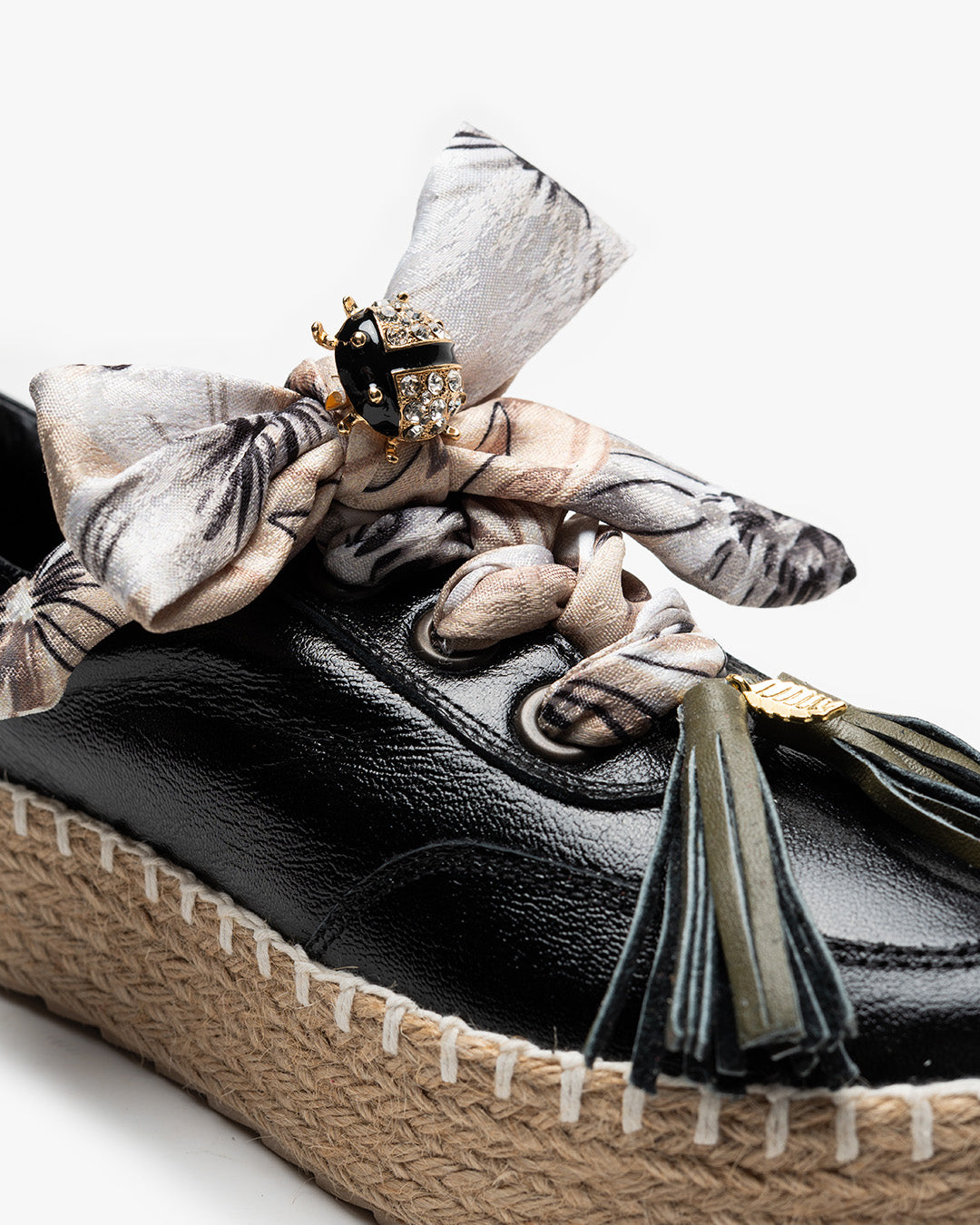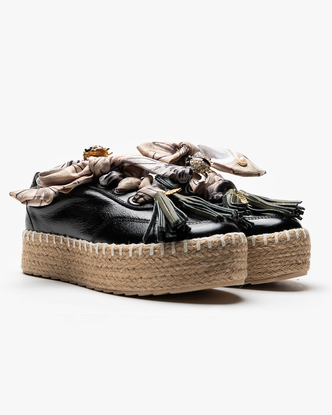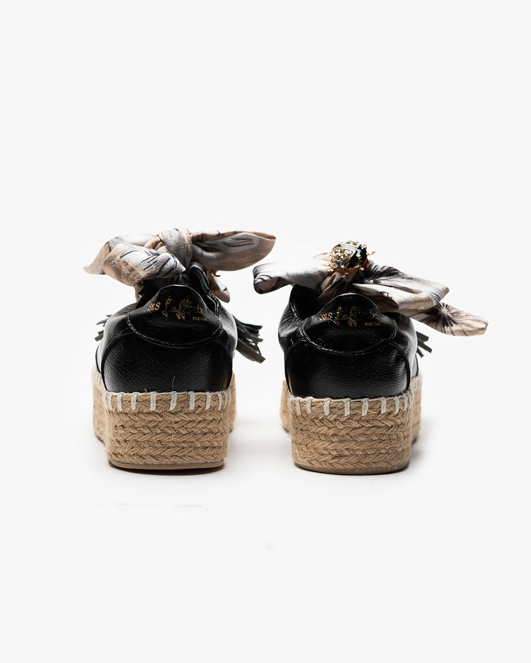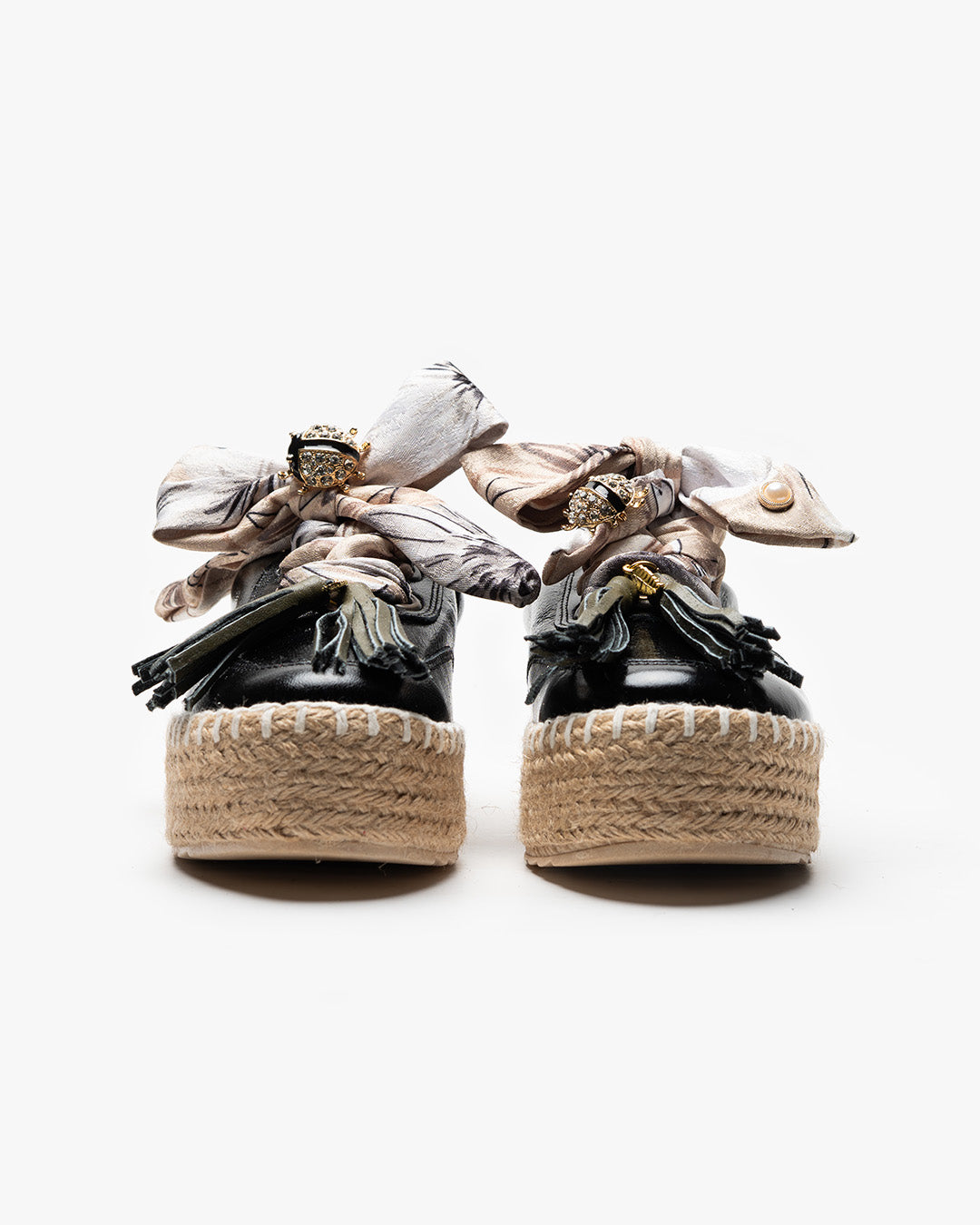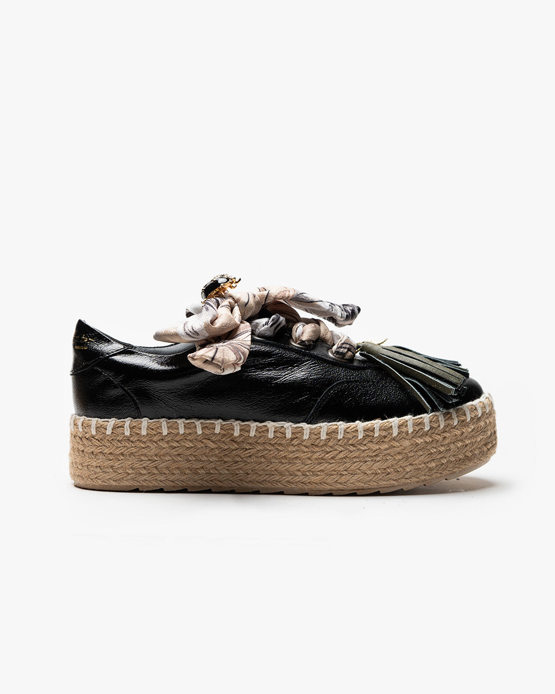 Nuestros zapatos son 100% piel, 5 cm de altura, yute, ultra cómodos y cada par incluye una mascada y un pompón. ¡Personalízalos aún más! También puedes comprar mascadas, pompones y pines por separado. Descubre la colección completa.